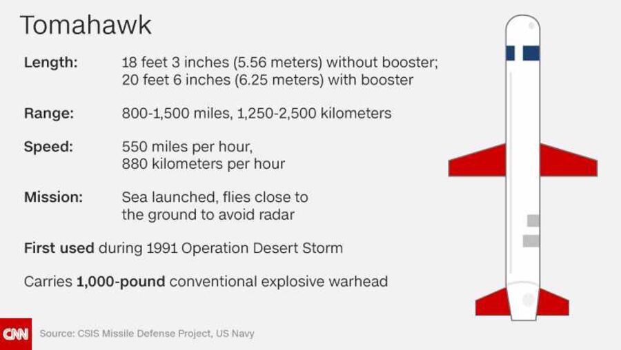Кроме того, по информации CNN, американские военные корабли запустили 59 крылатых ракет "Томагавк", ударив по авиабазе сирийского правительства. Там предположительно находились боевые самолеты, которые совершали химические атаки.